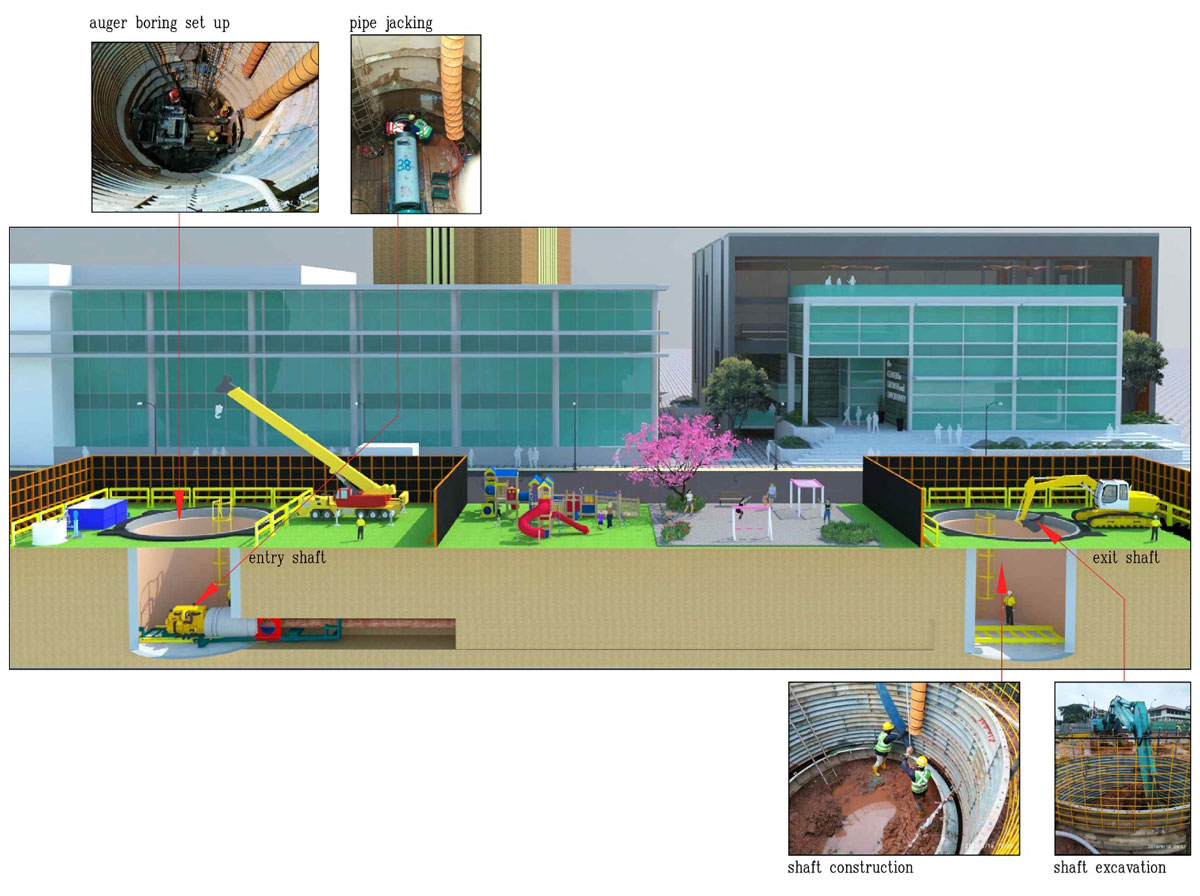 Khi áp dụng phương pháp khoan ngầm, nhu cầu đào đất cho tuyến đường ống dẫn điện ngầm nói chung sẽ được giảm thiểu. Thông thường, chúng tôi áp dụng phương pháp khoan ngầm, tùy thuộc vào hoàn cảnh của địa điểm làm việc, cho các công trình lắp đặt cáp điện, mạng viễn thông và cáp quang hoặc đường ống thoát nước cách mặt đất khoảng bốn mét trở lên.