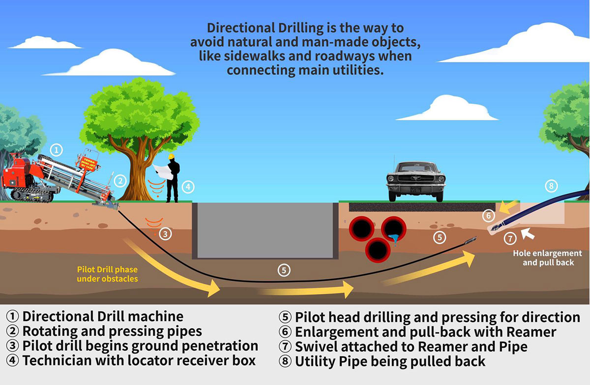 Đối với các công trình lắp đặt cáp điện, mạng viễn thông và cáp quang cách mặt đất khoảng bốn mét trở lên, chúng tôi thường áp dụng phương pháp khoan định hướng ngang. Như được minh họa trong sơ đồ sau, phương pháp HDD của chúng tôi là một cách để tránh các vật thể tự nhiên và nhân tạo như vỉa hè và lòng đường khi kết nối các tiện ích chính: