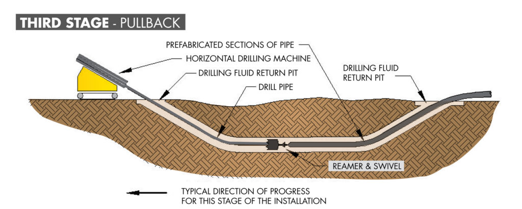 Giai đoạn thứ ba là kéo đường ống trở lại. Kéo đường ống đúc sẵn dọc theo lỗ ống mở rộng và kéo đường ống trở lại lỗ dẫn hướng để hoàn thành công việc vượt đường ống.