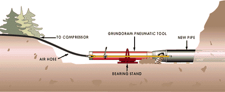 Lực đẩy được thực hiện nhờ một búa khí nén hoặc thủy lực, đập vào ống thép, xuyên qua mặt đất mà không làm biến đổi ống thép. Sau khi lắp đặt ống, vật liệu bên trong sẽ được lấy ra.