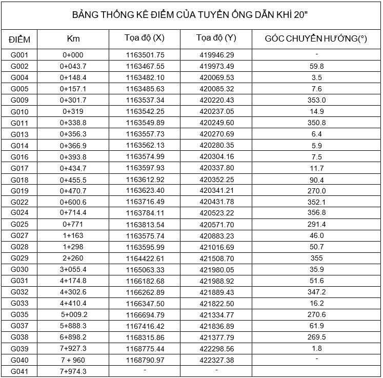 Thi công lắp đặt đường ống khí nén bắt đầu từ Km 0+000 tại kho LNG Hải Linh đi qua địa hình chủ yếu là men dọc đường trong khu công nghiệp với cao độ có chỗ đến -4,03 m so với cao độ Hòn Dấu đến Km 7+ 974.3 tại trạm phân phối khí GDS và có 7 đoạn băng qua đường. Có 29 điểm tuyến ống được xác định, trong đó có 26 vị trí biểu thị góc chuyển hướng từ G002 đến G039. Có toạ độ và góc chuyển hướng như bảng bên dưới.