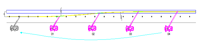 Sau khi cẩu số 4 và cẩu số 3 đã đưa ống xuống đáy mương đào, tháo cáp móc ống để cẩu di chuyển đến vị trí mới (như hình vẽ), cẩu số 1 và số 2 giữ nguyên.