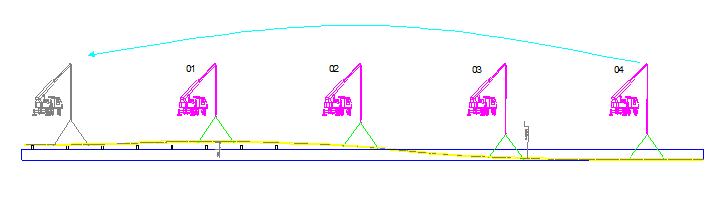 Đưa ống vào vị trí mương đào: Dùng 04 cẩu đồng thời nâng ống cách mặt đất khoảng 1m, cẩu số 4, cẩu số 3 và cẩu số 2 cùng ra cần để đưa ống vào vị trí mương đào nhưng cẩu số 4 ra cần nhanh hơn cẩu số 3 và cẩu số 3 ra cần nhanh hơn cẩu số 2 để có độ cong của ống đều (như hình vẽ), cẩu số 1 giữ nguyên.