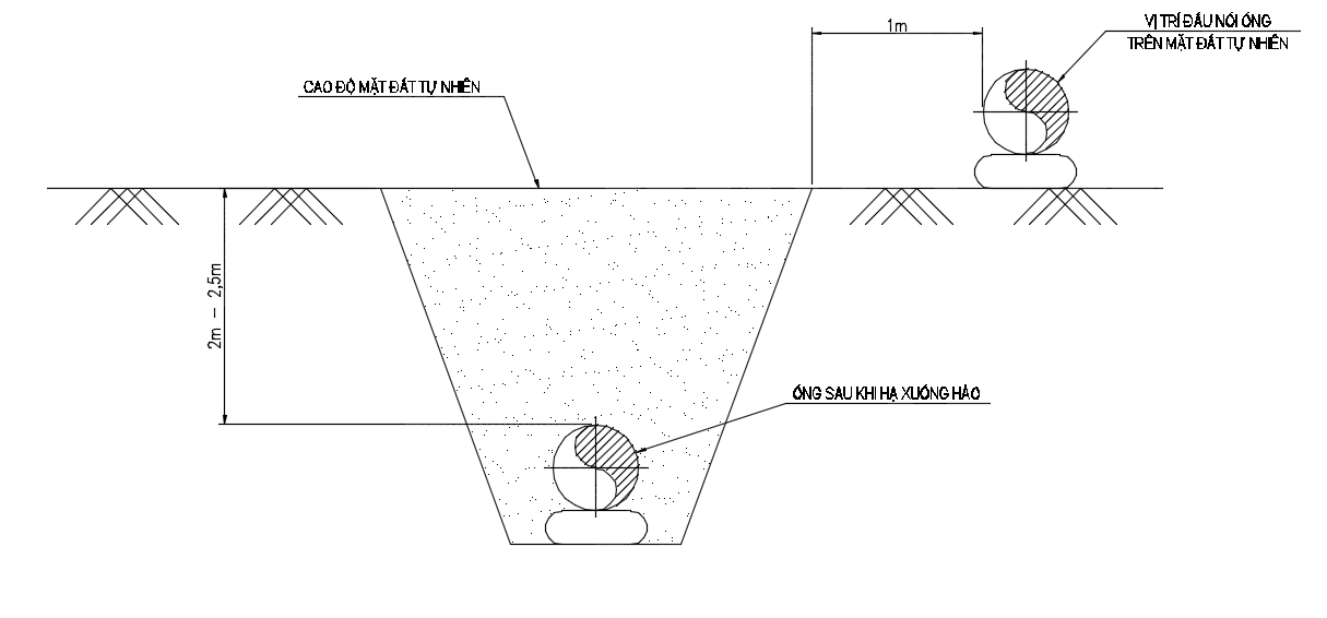 Các ống 12m sẽ được đặt lên gối cát để thi công cắt, lắp, hàn và bọc mối nối hàn như các bước đã nêu ở trên. Các ống sẽ được đặt trên gối cát ở cao độ tự nhiên của mặt đất, cách miệng hố đào theo thiết kế là 1m như hình dưới đây: