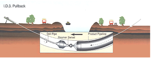 The casing pipe is pulled back by the thrust force of the drilling rig transmitted through the back reamer connected to a swivel. Using the rotate–pull technique, the drill string is gradually pulled back toward the rig. Drilling fluid is pumped into the borehole at an appropriate rate to minimize pipe friction and prevent borehole collapse.