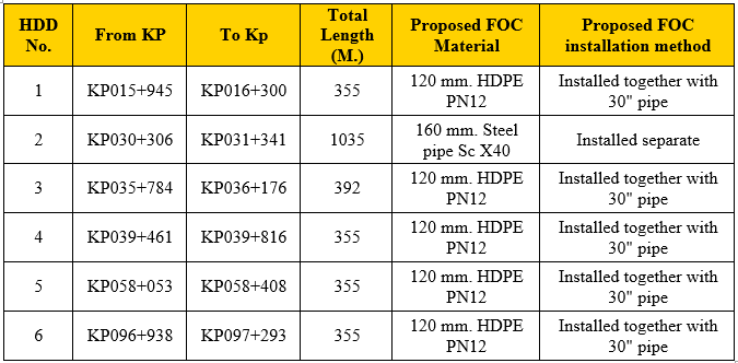 The HDD works will consist of the separate installation of 30” steel pipe with FOC conduit at 6 locations detail describe below.