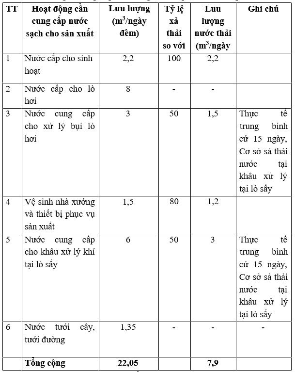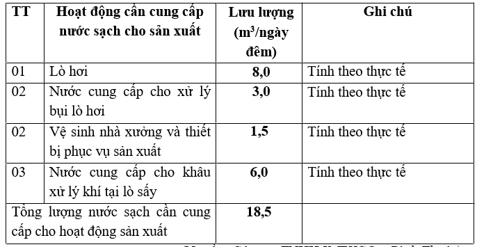 Bảng 1. Nhu cầu dùng nước cho hoạt động sản xuất