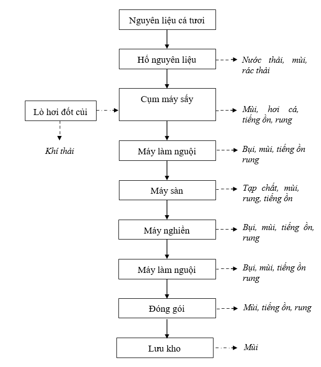 - Đối với mùi, khí thải: phát sinh mùi, khí thải (từ hoạt động hấp, sấy cá); khí thải (từ hoạt động đốt nhiên liệu để cung cấp lò hơi);