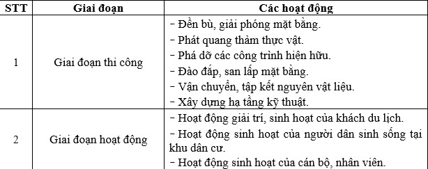 Bảng 1. 10. Các hoạt động của dự án khu du lịch nghỉ dưỡng