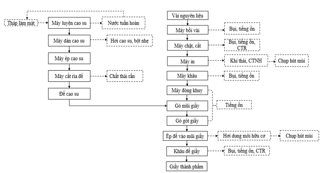 - Đế cao su: Nguyên liệu là cao su thiên nhiên, cao su khô tổng hợp cùng các loại hoá chất như bột CaCO3, một màu, bột hoá dẻo, lưu huỳnh và kẽm được cân định lượng sau đó đưa vào máy luyện. Quá trình luyện cao su diễn ra trong vòng 14 phút tạo ra các tấm cao su. Các tấm cao su tiếp tục được đưa sang máy cán để tạo thành các tấm cao su thành phẩm. Tấm cao su thành phẩm được đưa vào khuôn lên dàn ép để tạo thành đế. Đế được đưa qua máy cắt rìa để toạ thành đế cao su thành phẩm. Quá trình gia nhiệt nung cao su bằng năng lượng điện, vì vậy công đoạn này chỉ phát sinh hơi cao su.