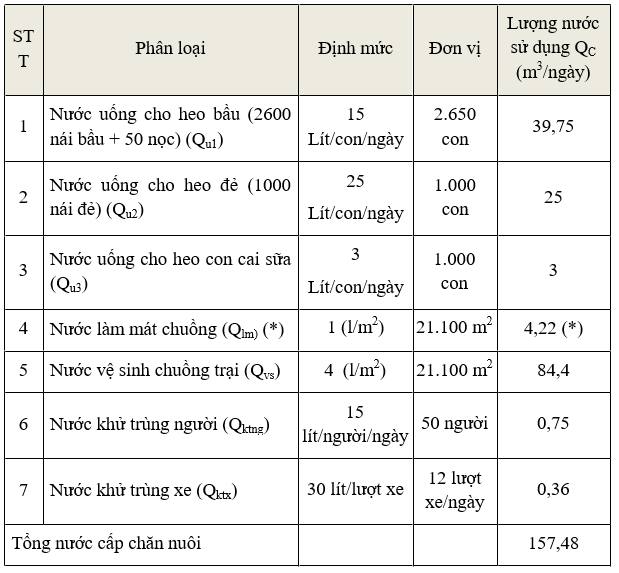 Căn cứ Nghị định số 80/NĐ-CP ngày 06 tháng 8 năm 2014 (điều 39) quy định lượng nước thải được tính bằng 80% lượng nước cấp, vì theo thực tế lượng nước vệ sinh chuồng trại sẽ tiêu hao vì khi rửa chuồng, một phần nước sẽ thấm xuống nền chuồng, vào hệ thống thu gom nước thải trước khi về hệ thống xử lý tập trung. Do đó, lượng nước vệ sinh chuồng trại sẽ được tính bằng 80% lượng nước cấp.