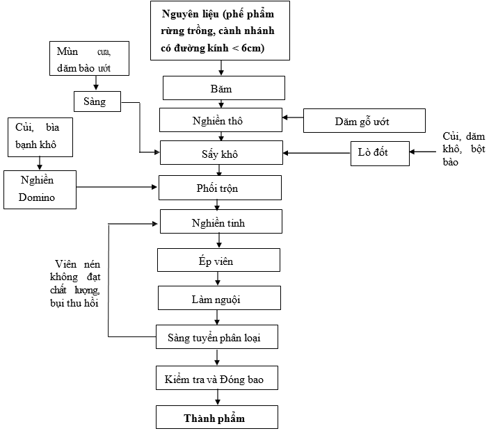 Nguyên liệu cho dây chuyền sản xuất gồm: phế phẩm rừng trồng, cành nhánh cây có đường kính < 6cm và củi bìa, gỗ ván lạng, mùn cưa, dăm bào, thu mua từ các nhà máy chế biến gỗ.