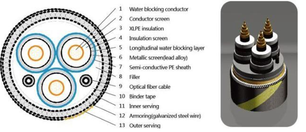 Tuyến cáp ngầm biển 35 kV được bố trí đi ngầm dưới đáy biển với độ sâu khoảng 1,5m tính từ đáy biển, có chiều dài khoảng 26.845 m để kết nối các tuabin gió với nhau và kết nối từ tuabin gió vào bờ. Tuyến cáp biển được chia làm 2 khu vực bao gồm:
