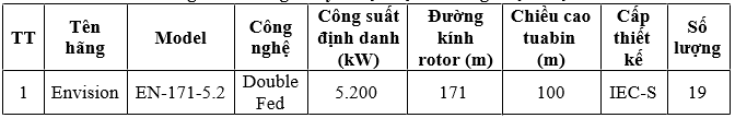 Trong giai đoạn lập Báo cáo nghiên cứu khả thi và thiết kế cơ sở, dự án lựa chọn tuabin gió EN-171-5.2 của nhà sản xuất Envision để tính toán các chỉ tiêu kỹ thuật cơ bản, trong giai đoạn thiết kế kỹ thuật và đấu thầu mua sắm thiết bị sẽ chọn loại tuabin cụ thể sao cho đảm bảo yêu cầu kỹ thuật và phù hợp với các yêu cầu của chủ đầu tư.