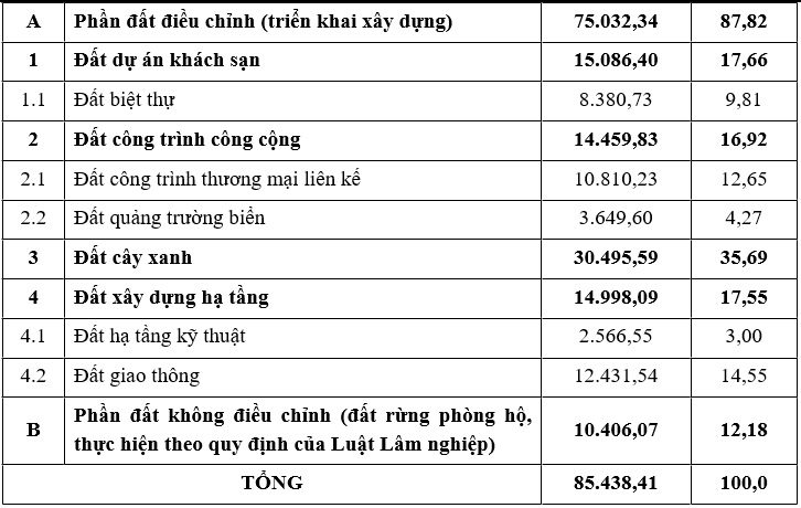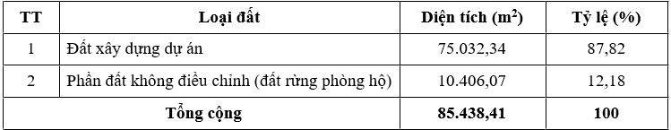 Tổng diện tích khu đất dự án là 85.438,41 m2. Trong đó, cơ cấu sử dụng đất của dự án được xác định như sau: