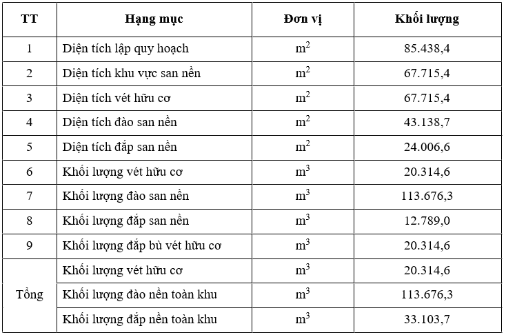 Bảng 4. Tổng hợp khối lượng công tác san nền