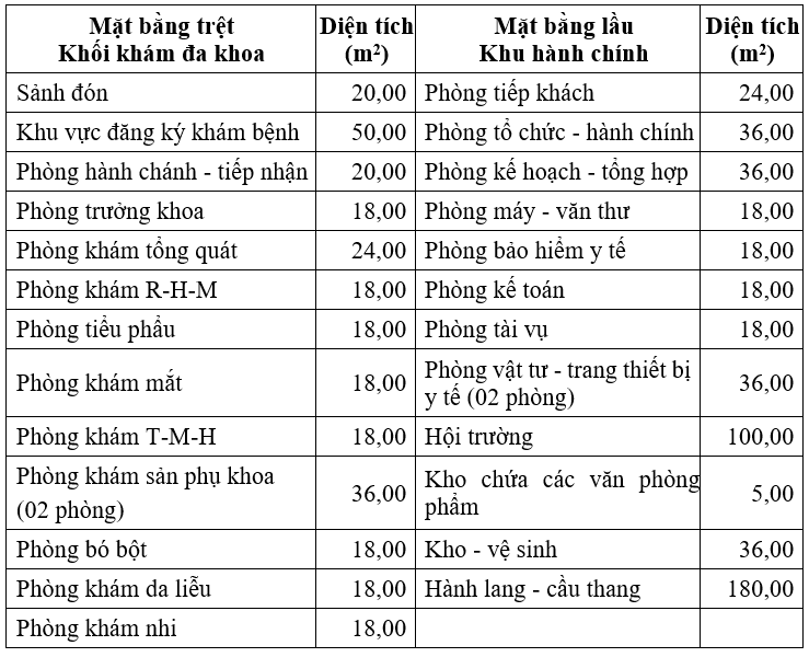 Bảng 1‑1: Hạng mục Khối Khám đa khoa - Hành chính