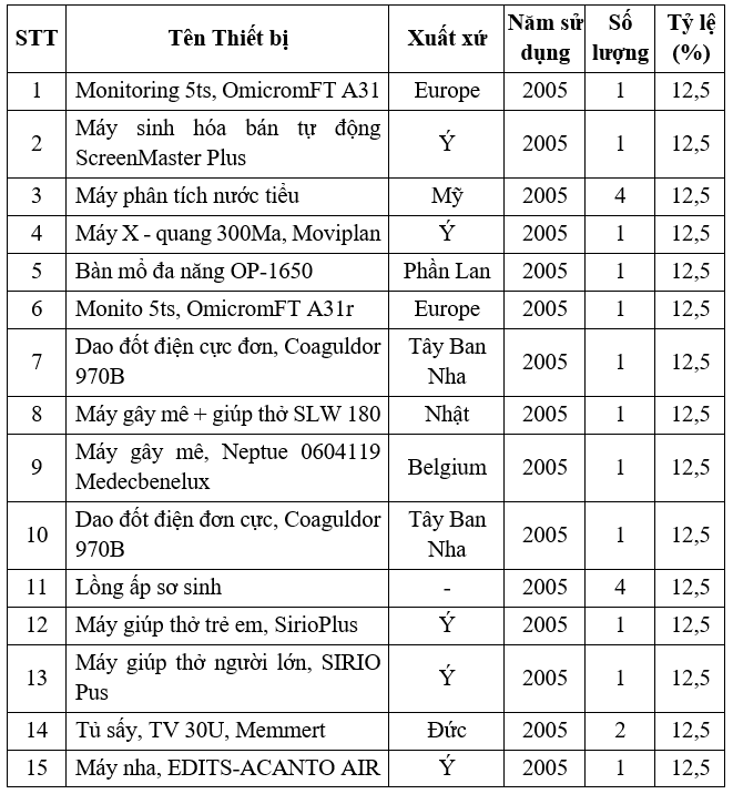 Bảng 1‑16: Danh mục trang thiết bị y tế của Cơ sở