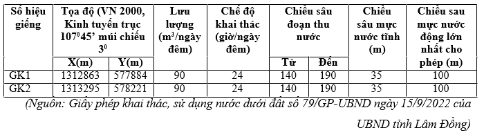 Hiện tại, nguồn nước cấp được lấy từ công trình khai thác nước dưới đất trong khu vực dự án và đã được UBND tỉnh Lâm Đồng cấp Giấy phép khai thác, sử dụng nước dưới đất số 79/GP-UBND ngày 15/9/2022 cho 02 giếng với lưu lượng cấp phép là 180 m3/ngày.