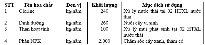 Hóa chất sử dụng của dự án bao gồm hóa chất xử lý nước thải và một số loại phân bón phục vụ chăm sóc cây xanh, thảm cỏ. Dự kiến nhu cầu sử dụng hóa chất như sau: