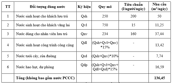 - Nhu cầu sử dụng nước: Nhu cầu dùng nước của KDL được xác định trên cơ sở số người khách, số nhân viên làm việc trong dự án. Chi tiết nhu cầu dùng nước của dự án được thể hiện ở bảng sau: