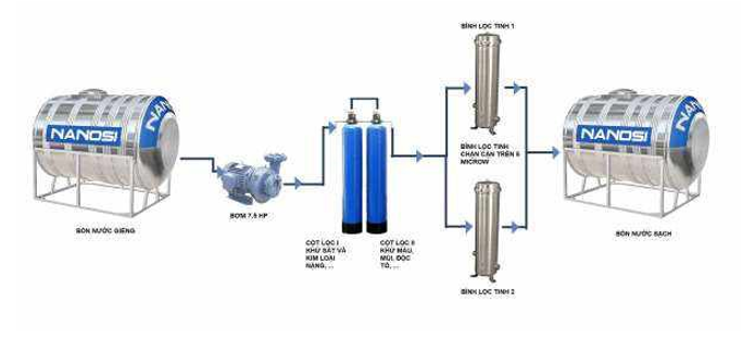 Nước dưới đất → Bồn chứa nước giếng → Cột lọc I (khử sắt và kim loại nặng) → Cột lọc II (khử màu, mùi, độc tố..) → Bồn lọc tinh → Bồn chứa nước sạch.