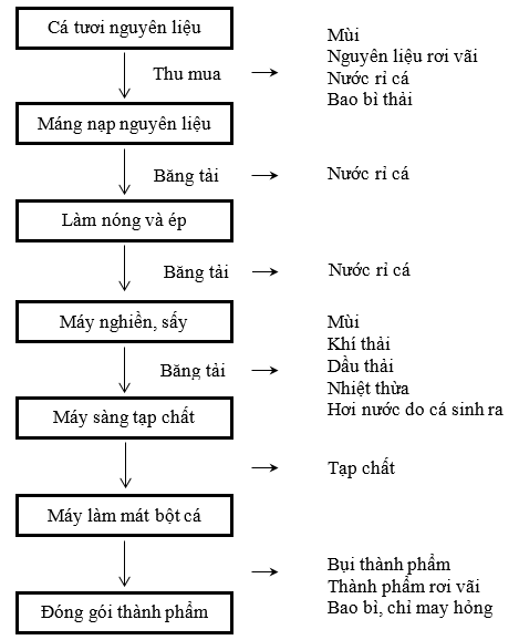 Giai đoạn nạp tải: Cá tươi thu mua từ ghe tàu đánh bắt hoặc phế phẩm đầu cá thu mua từ các nhà máy đông lạnh (nguyên liệu) theo máng nạp nguyên liệu được đưa vào máy làm nóng và ép cho ráo nước, tiếp theo sẽ được băng tải đưa qua máy nghiền sấy. Dòng thải: nước rỉ cá gồm vụn cá, protein, mỡ cá và nước; bao bì đựng nguyên liệu (nylon); nguyên liệu rơi vãi.