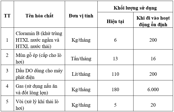 b. Nhiên liệu, hóa chất sử dụng: Dự án sử dụng các nhiên liệu cho hoạt động nấu ăn, hoạt động của lò hơi, hóa chất dùng cho hệ thống xử lý nước ngầm, hệ thống xử lý nước thải, hệ thống xử lý khí thải cụ thể: