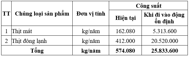 Từ tháng 05/2022 đến nay, Công ty đã đi vào hoạt động với công suất giết mổ khoảng 20 con/ngày và số lượng lao động là 20 người và khi đi vào hoạt động ổn định công suất giết mổ là 900 con/ngày với số lượng lao động dự kiến là 120 người.
