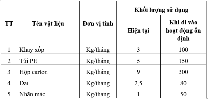 Căn cứ vào thực tế hoạt động tại Công ty thì lượng nước dùng vệ sinh nhà xưởng, máy móc hiện tại ước tính khoảng 1 m3/ngày và khi đi vào hoạt động ổn định ước tính khoảng 60 m3/ngày.