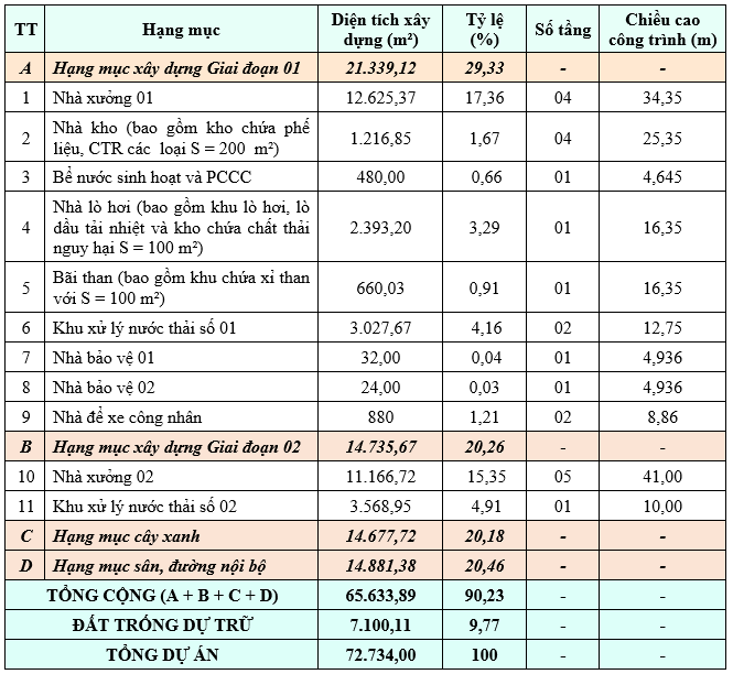 Trong giai đoạn này, Công ty chỉ triển khai xây dựng công trình nhà xưởng sản xuất và các công trình phụ trợ khác phục vụ cho Giai đoạn 01 và Giai đoạn 02, Công ty dự kiến phân bổ nhu cầu sử dụng đất như sau: