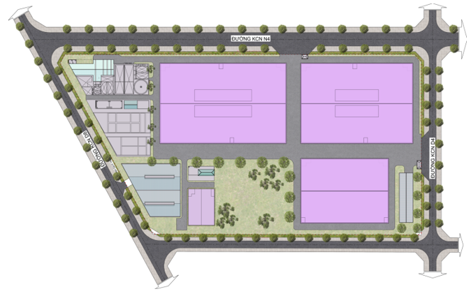 Hướng tiếp cận chính của khu đất được xác định từ đường KCN N4 và D4 của KCN Thành Thành Công. Từ hướng tiếp cận này, tổ chức các trục giao thông theo dạng bàn cờ đảm bảo kết nối thuận tiện, dễ dàng đến từng khu chức năng của nhà máy.