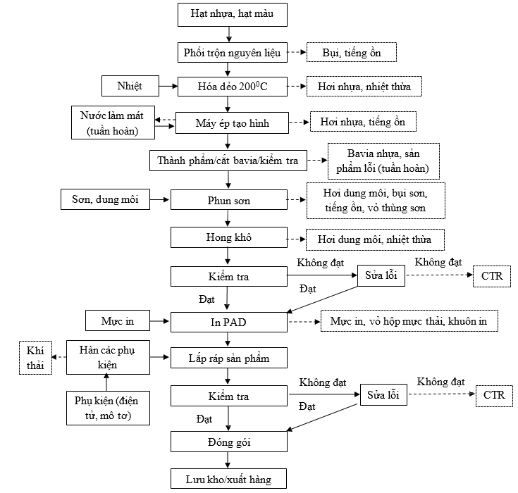 Công nghệ sản xuất của dự án áp dụng công nghệ sản xuất bán tự động. Các công đoạn trộn nguyên liệu, ép phun, cắt bavia được thực hiện bằng các thiết bị điều khiển tự động; công đoạn sơn được thực hiện theo công nghệ phun sơn pha dung môi đặt trong hệ thống buồng kín. Công đoạn lắp ráp và đóng gói sản phẩm thực hiện thủ công