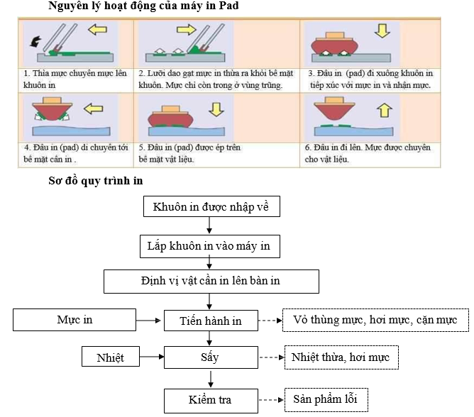 - Sau khi định vị khuôn vào máy in, vật cần in lên bàn, chi tiết cần in đặt vào khuôn in. Trên máy in có máy dập in trực tiếp lên chi tiết sản phẩm. Sản phẩm sau khi in được chuyển qua sấy khô bằng điện. Các bước in như sau: