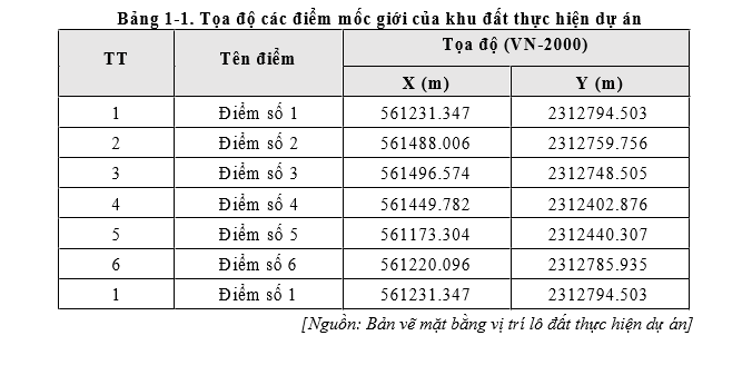 Tọa độ các điểm mốc giới của khu đất thực hiện dự án theo hệ tọa độ VN-2000 được thể hiện trong bảng dưới đây: