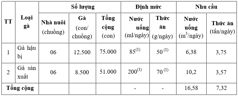 Theo Hướng dẫn kỹ thuật chăn nuôi gà , nhu cầu sử dụng nước uống cho gà thịt thời kỳ gà trưởng thành có định mức là 0,25 lít/con/ngày, với tổng đàn gà của trang trại là 120.000 con, nhu cầu sử dụng nước uống cho gà là: Qnước= 0,25 × 120.000 = 30.000 lít/ngày = 30 m3/ngày.