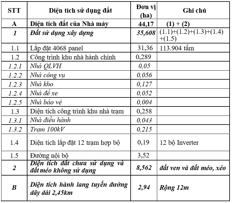 Ghi chú: Tổng diện tích chiếm đất vĩnh viễn của Nhà máy là 44,17 ha, bao gồm: 35,608 ha đất chiếm dụng cho hệ thống giá đỡ, đất hành lang tuyến cho các tuyến điện phân phối liên kết giữa các hệ thống tấm pin mặt trời, đất xây dựng các trạm điện nâng áp, đất cho nhà điều hành nhà máy ĐMT, đất cho đường giao thông phục vụ vận hành và 8,562 ha đất chưa đưa vào sử dụng do đất méo, xéo và đồi dốc.