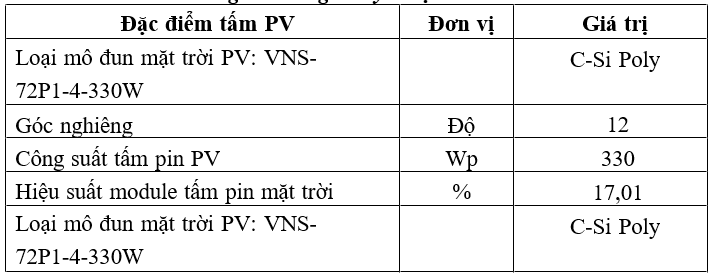Bảng 3. Thông số kỹ thuật của tấm PV