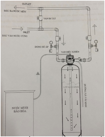 Nước cấp được bơm áp đẩy qua quá trình lọc trao đổi ion (áp suất đầu vào nên đạt được 1.5 – 2.5 bar) đưa vào cột lọc chứa hạt nhựa trao đổi ion, thông qua quá trình trao đổi ion để loại bỏ những tạp chất gây ra độ cứng: Canxi, magie … trong nước. Sau một thời gian hoạt động, Cơ sở dùng dung dịch muối tinh khiết để tái sinh hạt nhựa trao đổi ion (bổ sung ion Na+).