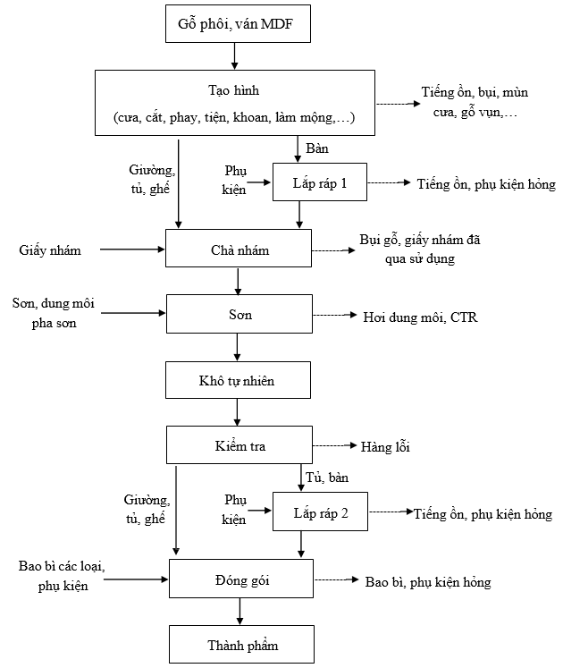Tiếp theo, gỗ phôi hay ván thành phẩm được đưa vào công đoạn tạo hình thô (cưa, cắt) theo các kích thước yêu cầu. Công đoạn này sử dụng máy cưa, cắt. Trong quá trình hoạt động của máy phát sinh gỗ vụn, mạt cưa, bụi gỗ và tiếng ồn. với mỗi dòng sản phẩm khác nhau, tùy thuộc vào yêu cầu của khách hàng, các dây chuyền máy được lắp các chi tiết sản xuất tương ứng như lưỡi cưa, kẹp vít, giấy nhám,… đảm bảo độ linh động khi sản xuất các dòng sản phẩm khác nhau. Gỗ vụng, mạt cưa rơi vải dưới sàn được thu gom quét dọn vào thùng chứa chất thải công nghiệp vào cuối ca. Bụi gỗ phát sinh từ công đoạn này được thu gom vào chụp hút à ống dẫn à cyclone à buồng chứa bụi.