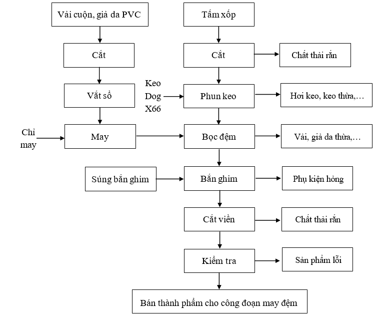 Tấm xốp PU Foarm, vải cuộn và giả da sau khi nhập về được cắt theo kích thước của từng loại ghế. Sau khi cắt, công nghân tiến hành phun keo lên bề mặt tấm xốp. Keo mà cơ sở sử dụng là loại keo có pha dung môi Dog X66, với thành phần chính là toluene. Tại khu vực phun keo, chủ cơ sở đã bố trí 01 buồng phun keo với kích thước 2,5m × 1,5m × 2m. Công đoạn này phát sinh hơi dung môi, keo thừa và các thùng đựng keo.