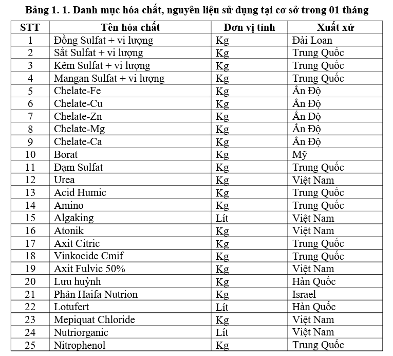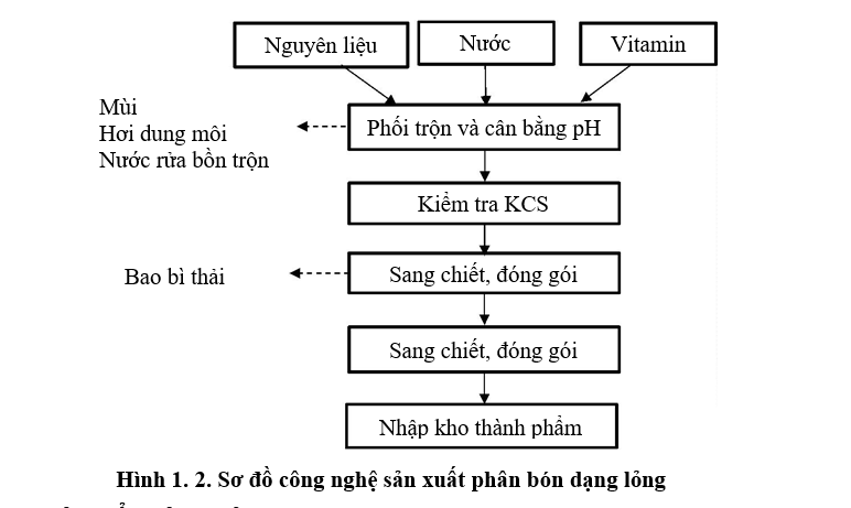 Nguyên liệu (gồm các vi lượng dạng Chelate Sắt, Chelate đồng, ure, acid humic) và vitamin sau khi mua về sẽ được cân, định lượng theo tỷ lệ nhất định và ứng với mỗi loại sản phẩm phân bón hữu cơ hay vô cơ sẽ có tỷ lệ pha trộn khác nhau, sau đó được cho vào bồn phối trộn (bồn trộn bằng Inox 1000L khuấy trộn tự động), quá trình di chuyển, cân, đong các nguyên liệu đều làm thủ công. Do độ hoà tan của từng loại hóa chất khác nhau với khối lượng hoá chất khác nhau và thời gian trộn sẽ dao động (30 phút – 60 phút). Sau khi phối trộn sẽ được cân chỉnh pH (bằng dung dịch NaOH hoặc acid citric) sao cho pH= 7 bằng thiết bị đo pH kế trước khi chuyển qua bồn khuấy trộn ổn định bằng hệ thống đường ống kín. Sản phẩm thành phẩm sẽ được đưa qua hệ thống đường ống vào máy chiết rót nước lỏng sử dụng áp thủy lực bán tự động. Từ đây sản phẩm sẽ được đóng gói, chiết rót vào chai và chuyển sang khâu dán nhãn, đưa vào kho chờ xuất hàng, quá trình này được thực hiện bởi các công nhân từ khâu đóng gói, đóng chai, dán nhãn đến vận chuyển vào kho. Sản phẩm bán thành phẩm trước khi đưa vào hệ thống ống để chuyển vào máy chiết rót thì bộ phận KCS sẽ tiến hành lấy 3 mẫu để lưu kho (1 mẫu để lưu kho, 2 mẫu gửi đi phân tích tại các trung tâm phân tích có chức năng do nhà nước qui định).