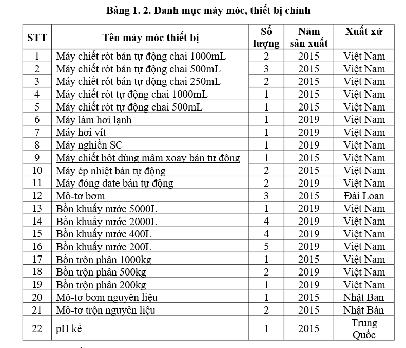Các thiết bị máy móc phục vụ cho cơ sở sản xuất bao gồm các thiết bị có sẵn từ các đơn vị. Danh mục máy móc chính theo Bảng 1.2. Trong trường hợp cúp điện, công ty sẽ dừng hoạt động, không trang bị máy phát điện dự phòng.