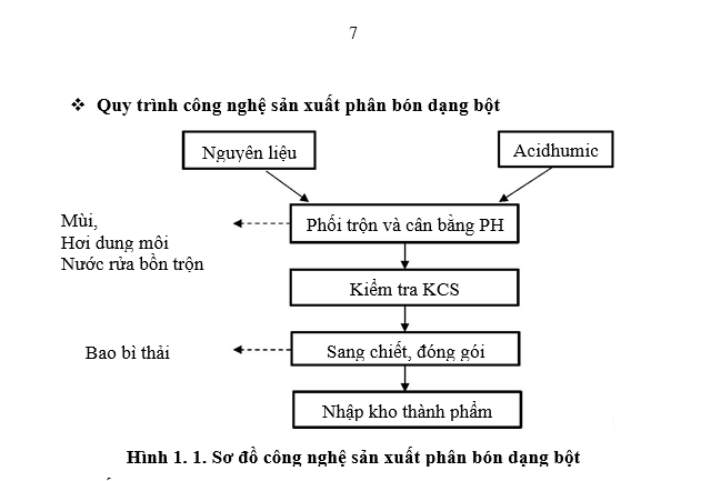 Nguyên liệu (gồm các vi lượng CuSO , ZnSO , FeSO , Borat, ure) và acid humic sau khi mua về sẽ được cân đong, định lượng theo tỷ lệ nhất định và ứng với mỗi loại sản phẩm phân bón hữu cơ hay vô cơ sẽ có tỷ lệ pha trộn khác nhau được cho vào bồn phối trộn (bồn trộn bằng nhựa 1000L khuấy trộn tự động), quá trình di chuyển, cân, đong các nguyên liệu đều làm thủ công. Tại công đoạn trộn sẽ có thời gian phối trộn khác nhau cụ thể: Tùy từng loại sản phẩm mà có thời gian trộn khác nhau vì độ đồng đều của từng loại sản phẩm khác nhau do công thức khác nhau thời gian trộn có thể dao động từ 10 – 30 phút, quá trình trộn được trộn trong bồn khuấy trộn ổn định bằng hệ thống đường ống kín. Sản phẩm thành phẩm sẽ được đưa qua hệ thống đường ống vào máy chiết rót bán tự động sử dụng piston hơi. Từ đây sản phẩm sẽ được đóng gói, vô chai và chuyển sang khâu dán nhãn, đưa vào kho chờ xuất hàng, quá trình này được thực hiện bởi các công nhân từ khâu đóng gói, vô chai, dán nhãn đến vận chuyển vào kho. Sản phẩm trước khi chuyển sang máy chiết rót sẽ được công nhân KCS lấy 3 mẫu để lưu kho (1 mẫu để lưu kho, 2 mẫu gửi đi phân tích tại các trung tâm phân tích).