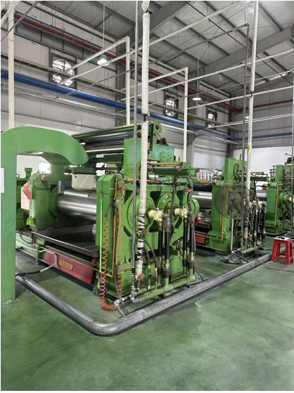 ‐ Cán thành tấm: Quá trình cán thành tấm được thực hiện bằng máy cán. Máy cán được thiết kể bởi các trục lăn, quá trình xoay các trục lăn sẽ ép nguyên liệu thành dạng tấm. Nhiệt được cấp từ lò hơi trong vòng 1 giờ đầu để gia nhiệt cho máy, sau đó máy sẽ tự động duy trì nhiệt độ trong quá trình hoạt động và van cấp nhiệt từ lò hơi được khoá lại để tránh phát sinh nhiệt thừa. Đồng thời, nước được cấp với mục đích làm mát máy. Cao su sau khi cán được chuyển qua công đoạn làm mát.