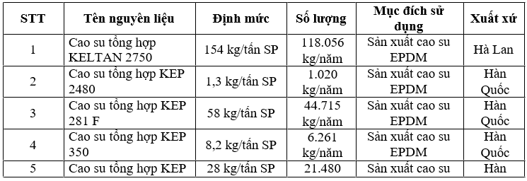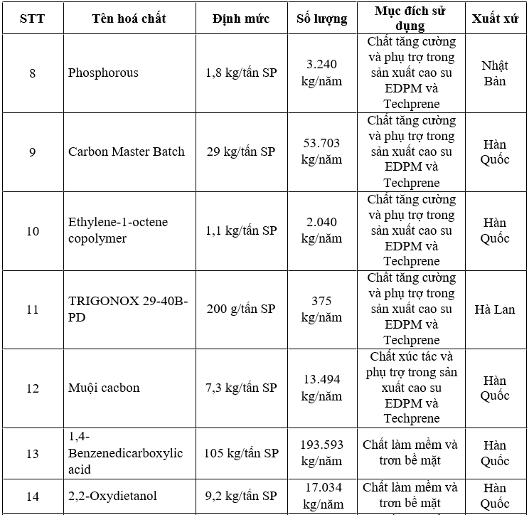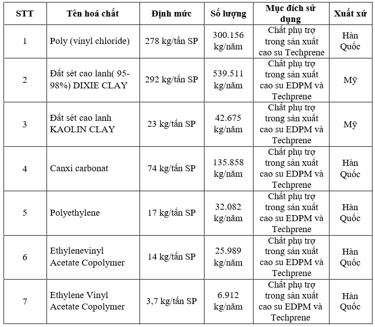 - Hoá chất: Trong quá trình hoạt động của nhà máy, có sử dụng các hóa chất, phụ liệu cho dây chuyền sản xuất. Danh sách các loại hóa chất, phụ liệu sử dụng như sau: