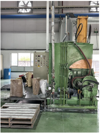 ‐ Nhào nhuyễn: Sau khi khuấy trộn, hỗn hợp cao su được đưa qua công đoạn nhào nhuyễn bằng máy nhào. Máy nhào được thiết kế bởi các trục lăn, quá trình xoay các trục lăn làm tăng độ dẻo cho cao su. Nhiệt được cấp từ lò hơi trong vòng 1 giờ đầu để gia nhiệt cho máy, sau đó máy sẽ tự động duy trì nhiệt độ trong quá trình hoạt động và van cấp nhiệt từ lò hơi được khoá lại để tránh phát sinh nhiệt thừa. Đồng thời, nước được cấp với mục đích làm mát máy. Khi cao su đạt đến độ dẻo nhất định sẽ được đưa qua công đoạn cán thành tấm.