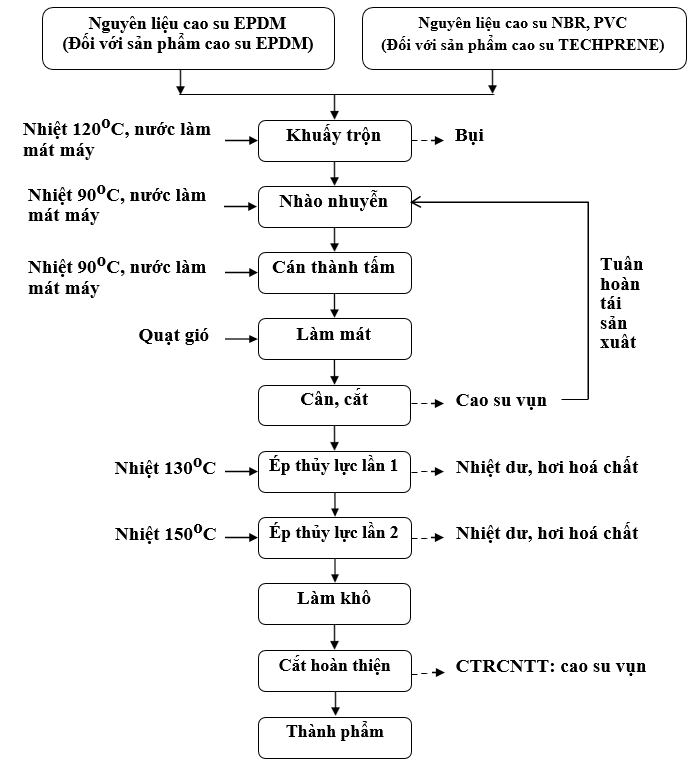 Tùy vào đơn đặt hàng của khách hàng mà Công ty sẽ phối trộn nguyên liệu theo tỷ lệ phù hợp. Đối với sản phẩm cao su EPDM thì nguyên liệu đầu vào chủ yếu là cao su EPDM. Đối với sản phẩm cao su TECHPRENE thì nguyên liệu đầu vào chủ yếu là cao su NBR, PVC. Cả 2 sản phẩm được thực hiện trên cùng 1 dây chuyền sản xuất, chỉ khác nhau ở tỷ lệ nguyên liệu đầu vào. Trình tự quá trình sản xuất được trình bày như sau: