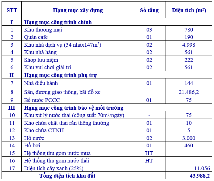 Dự án được đầu tư với quy mô xây dựng khu nhà dịch vụ (34 nhà), khu thương mại, khu nhà hàng, khu vui chơi giải trí, quán café, shop lưu niệm,… trên tổng diện dự án 43.988,2m2. Tổng số lao động dự kiến là 115 người.