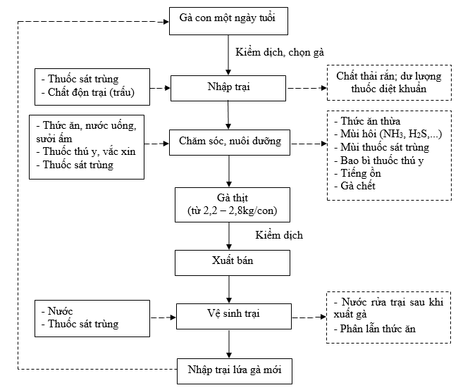 Nguyên liệu sử dụng cho hoạt động của trại là gà giống một ngày tuổi. Quy trình công nghệ chăn nuôi được trình bày như sau: